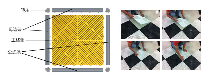Multifunctional modular floor mat with high strength, waterproof and oil bearing, brilliant color, simple construction, waterproof and antifouling, odorless and non-toxic and many other advantages, is widely used in the family balcony, car repair shops, car 4S stores, bath center, exhibition hall, public toilet, hotel corridor and other places.